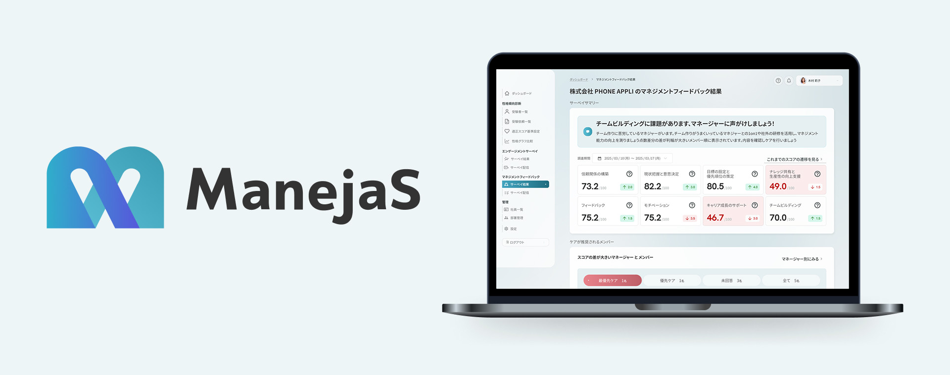 ManejaSは、複雑化するマネジメント業務のなかで、マネージャーとメンバーとの認識ギャップや組織課題を“可視化”し、具体的なアクション提案まで一気通貫で支援するクラウドサービスです。エンゲージメントサーベイ、性格傾向診断、マネジメントフィードバックなど多角的なデータを活用し、現場の状況や個々の特性に合わせた最適なマネジメントを実現します。これにより、マネージャーの負担軽減とチームの行動変容を促し、人材の活躍支援や組織全体のエンゲージメント向上に貢献します。