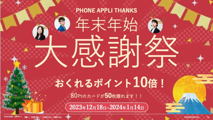 自社開発アプリ「PHONE APPLI THANKS」を使って、日頃の感謝をメッセージとポイントと共に贈ります。